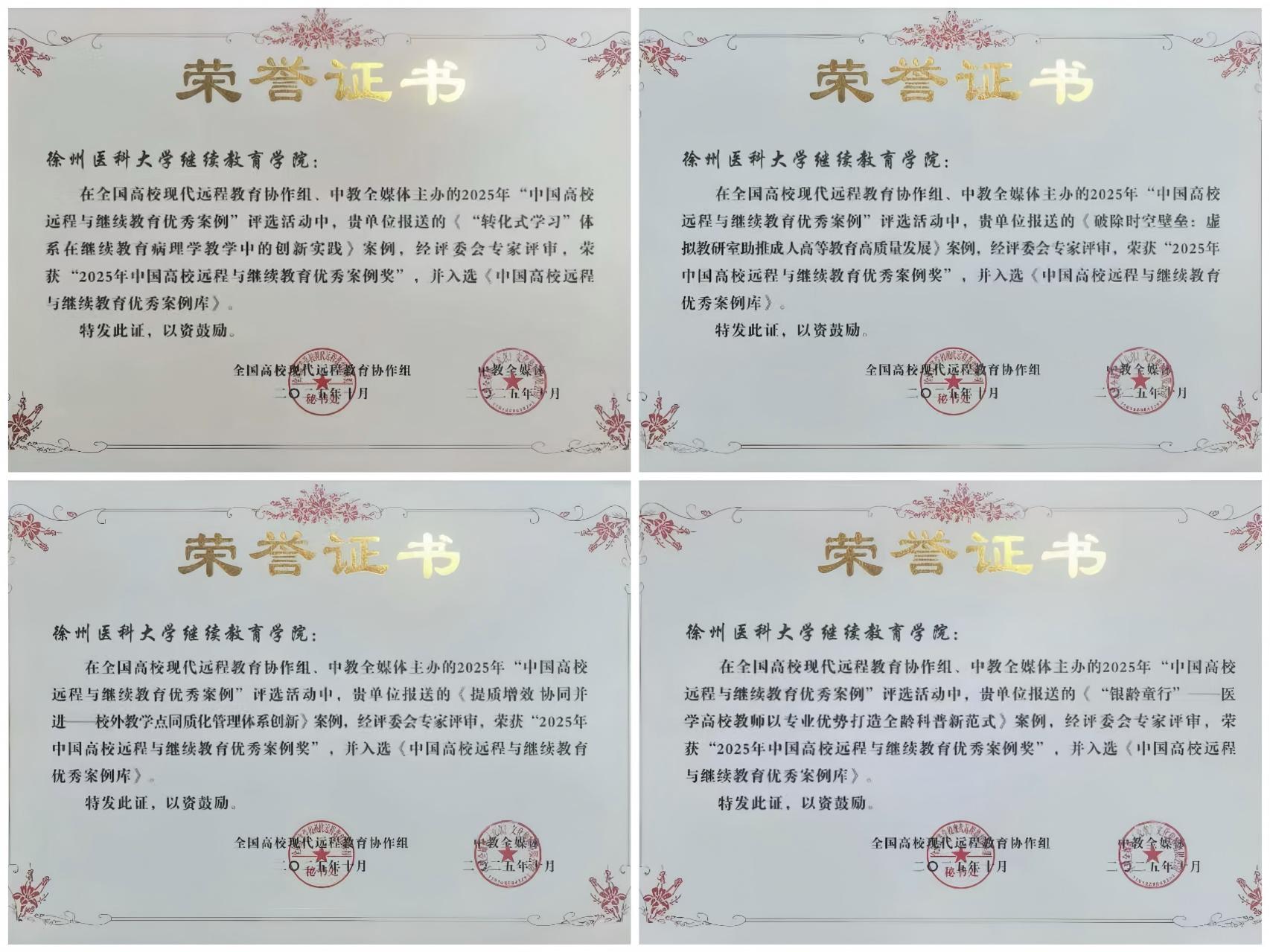 与此同时,学院组织申报的《“转化式学习”体系在继续教育病理学教学中的创新实践》《“银龄童行”——医学高校教师以专业优势打造全龄科普新范式》等四项工作案例,荣获“2025年中国高校远程与继续教育优秀案例奖”。