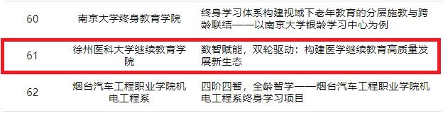 近日,中国成人教育协会公布2025年高校继续教育典型案例推介名单,徐州医科大学继续教育学院申报的案例——《数智赋能,双轮驱动:构建医学继续教育高质量发展新生态》成功入选,成为全国获评的75个典型实践之一。