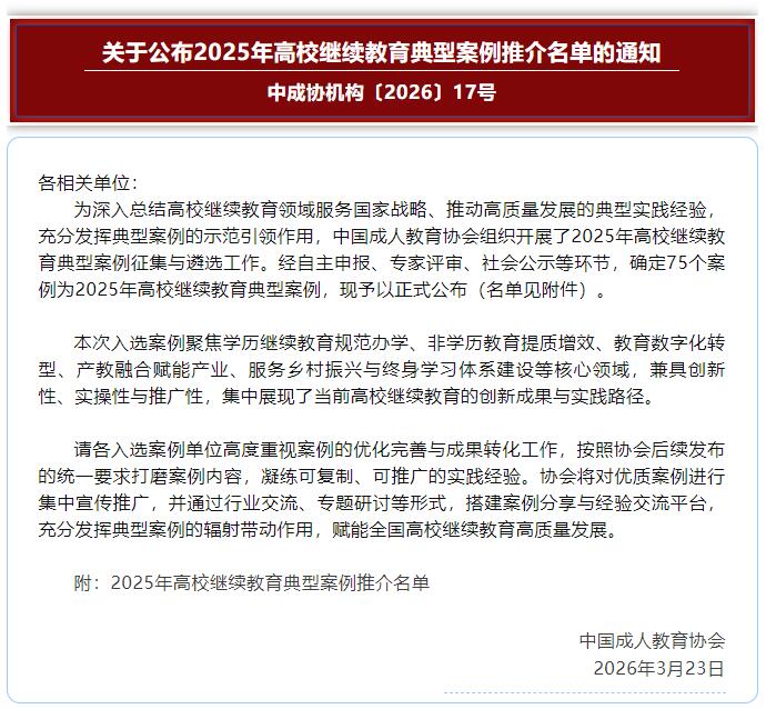 本次案例征集与遴选工作由中国成人教育协会组织开展,旨在总结推广高校继续教育服务国家战略、推动高质量发展的先进经验。经单位自主申报、专家严格评审及社会公示等多重环节,最终确定推介名单。入选案例集中于学历继续教育规范办学、非学历教育提质增效、教育数字化转型、产教融合、服务乡村振兴与终身学习体系建设等重点领域,展现了当前高校继续教育改革的创新成果与实践路径。