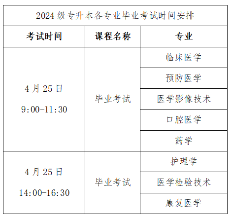 毕业考试时间为2026年4月25日,考试形式为线下集中考试(学习通平台),考试内容共200道单项选择题,答题时间为150分钟。请按照上课所用教材进行复习,可参考执业资格考试习题。