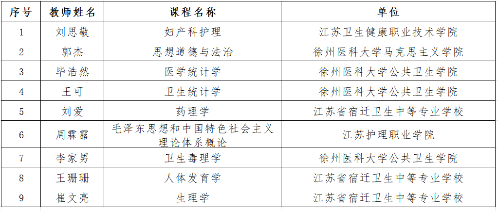 根据《省政府教育督导委员会办公室关于印发江苏省高校学历继续教育专项督导实施方案的通知》(苏教督委办函(2022)41号)文件精神,为进一步规范教学,促进教师钻研教材,合理设计课堂教学环节,不断提升教育教学质量,继续教育学院开展2025年优秀教案讲稿评选活动,经专家评审,《中国近现代史纲要》等18门课程评为“优秀教案讲稿”,江苏省宿迁卫生中等专业学校获优秀组织奖,现将结果公示如下: