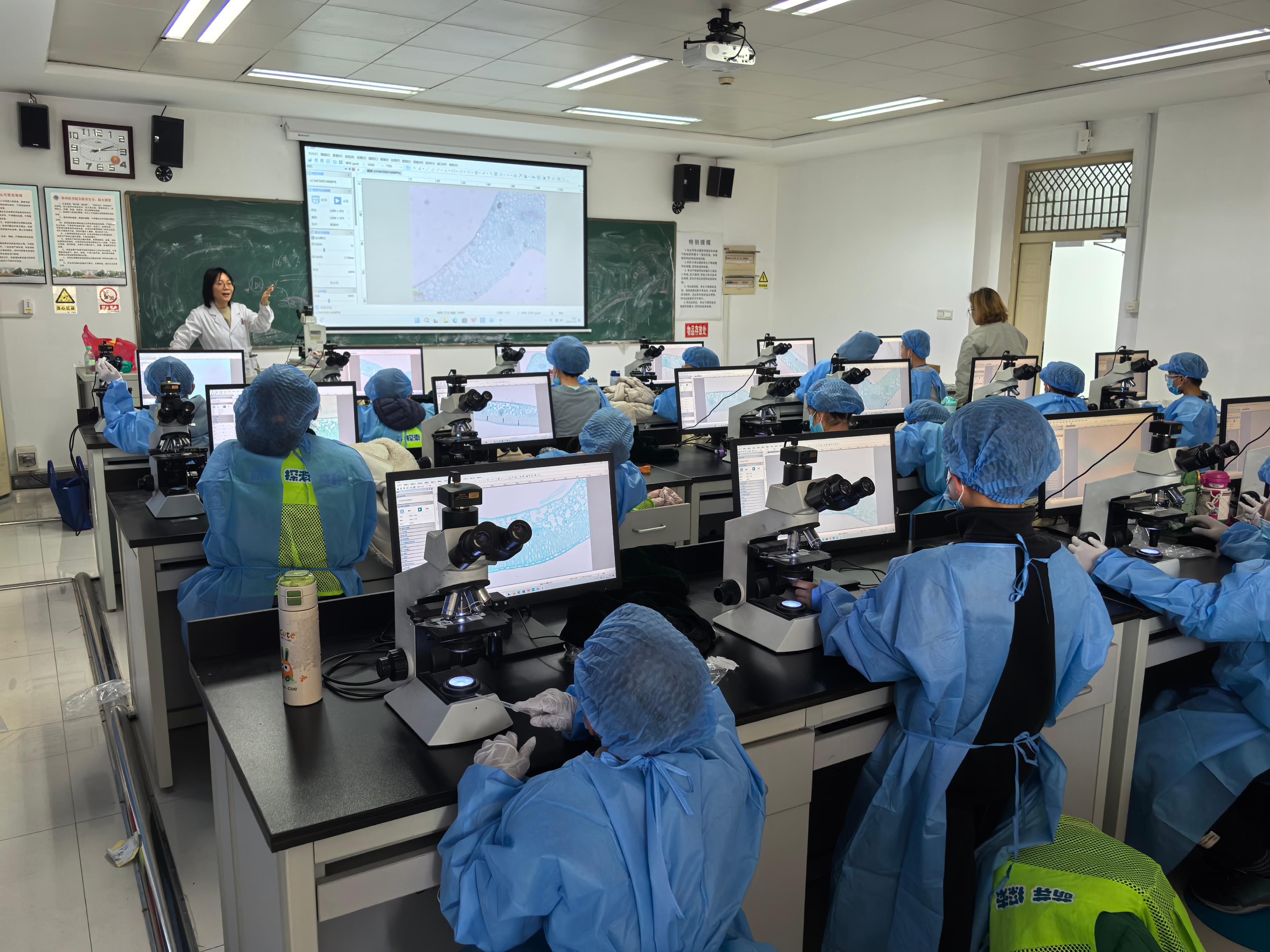 下午的实践课程为本次研学的核心亮点。学员们走进徐州医科大学病理实验室,沉浸式体验由病理学教研室联合徐医附院病理科打造的“医镜探微·知行合医”专题课堂。老师们用通俗化的表达将专业知识进行拆解,将抽象的病理原理与生活实例相结合,让青少年轻松理解医学逻辑。课堂上,学员们化身“小小病理师”,在老师们的悉心指导下,规范操作显微镜,小心翼翼地观察植物细胞、人体组织切片,透过微观镜头感受医学的严谨性与科学性。实验课程后,中药香包制作实践环节让大家亲手体验中医药文化,在香料配伍、缝制香囊的过程中,传承中华传统医学智慧,感受非遗文化与医学科普的碰撞。